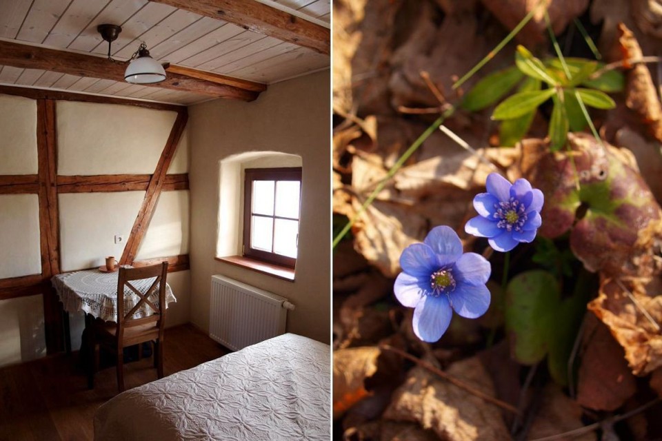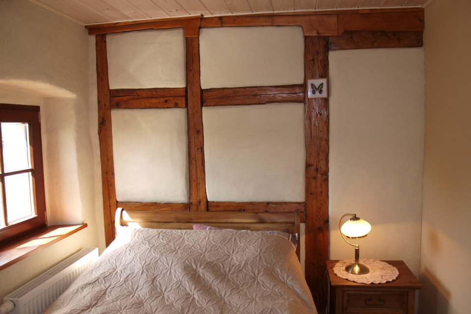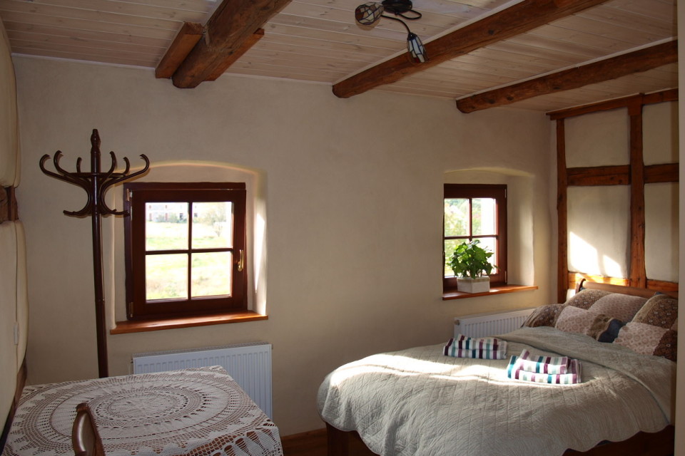 Hier gibt es ein breites Bett – für eine oder zwei Personen (120×200), ein Bad mit Dusche und vom Fenster aus kann man den Blick über die Berge von Konradwaldau und das malerische Anwesen des Nachbarn schweifen lassen.